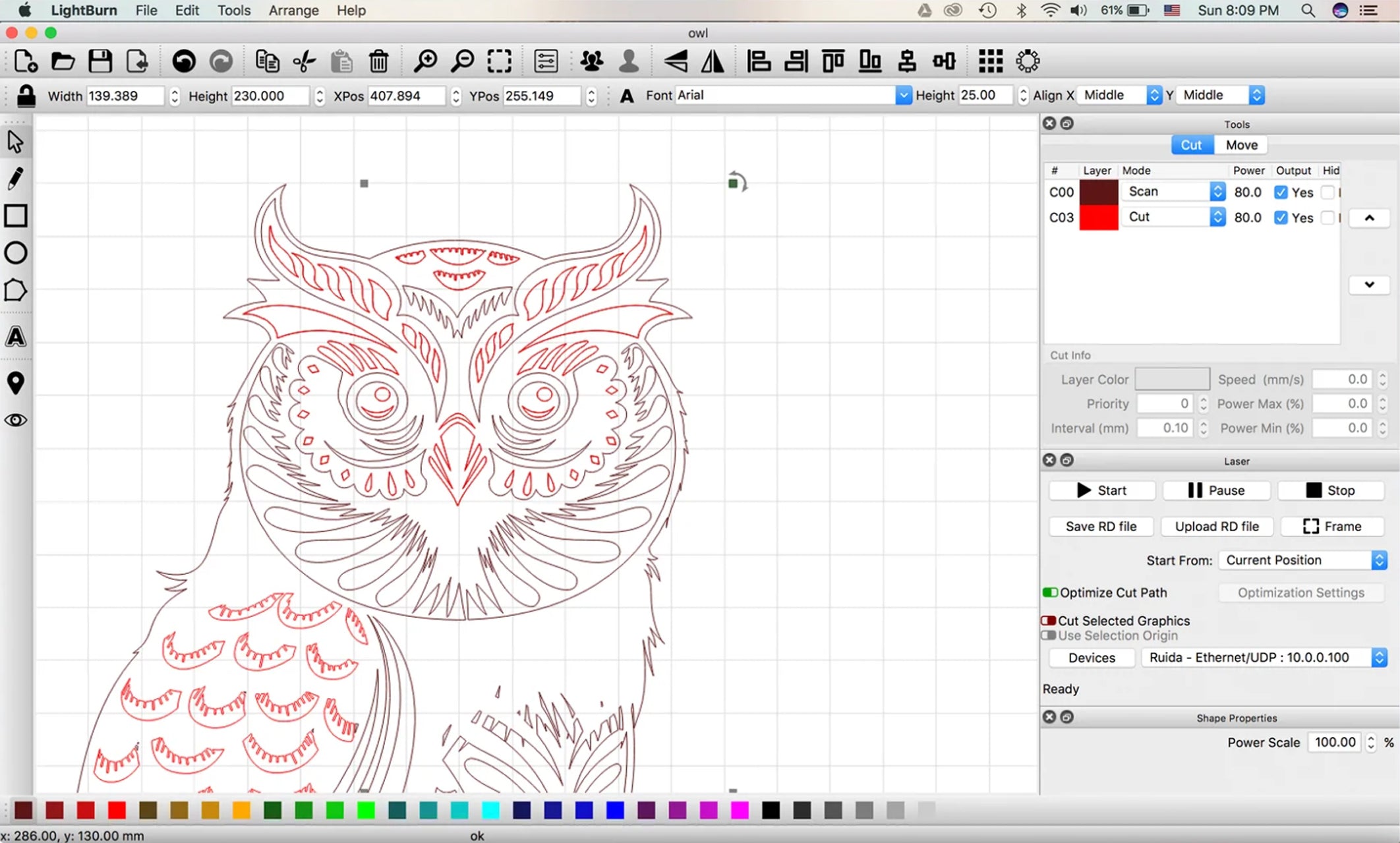 - Apply settings like power, speed, number of passes, cut order, brightness & contrast, dithering mode, and much more.